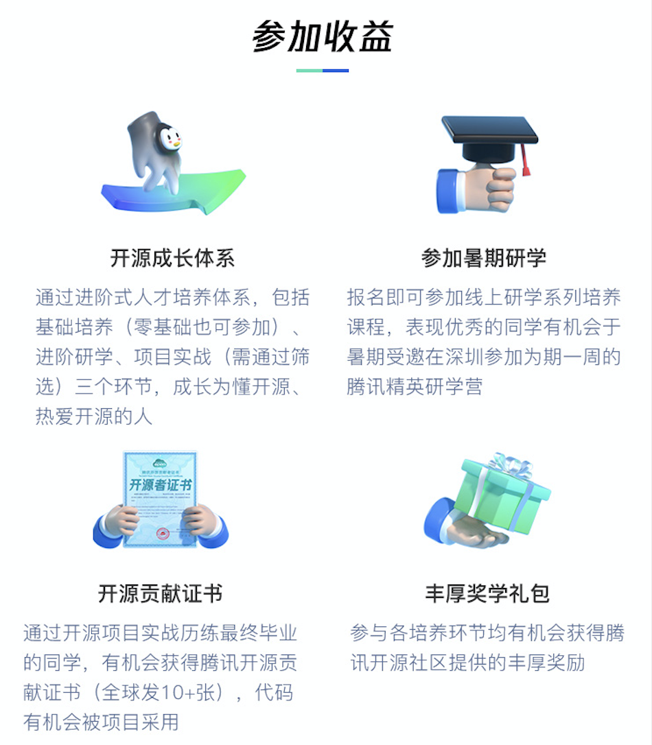 成功入选开源项目实战的同学,将在导师的一对一指导下,利用暑假开展编程实战,表现优秀者还将受邀到深圳参加为期一周的腾讯精英研学营,并有机会获得腾讯开源贡献者证书(全球将只会发出10+张),以上各个培养环节,参与的同学均有机会获得腾讯开源社区提供的丰厚奖励。