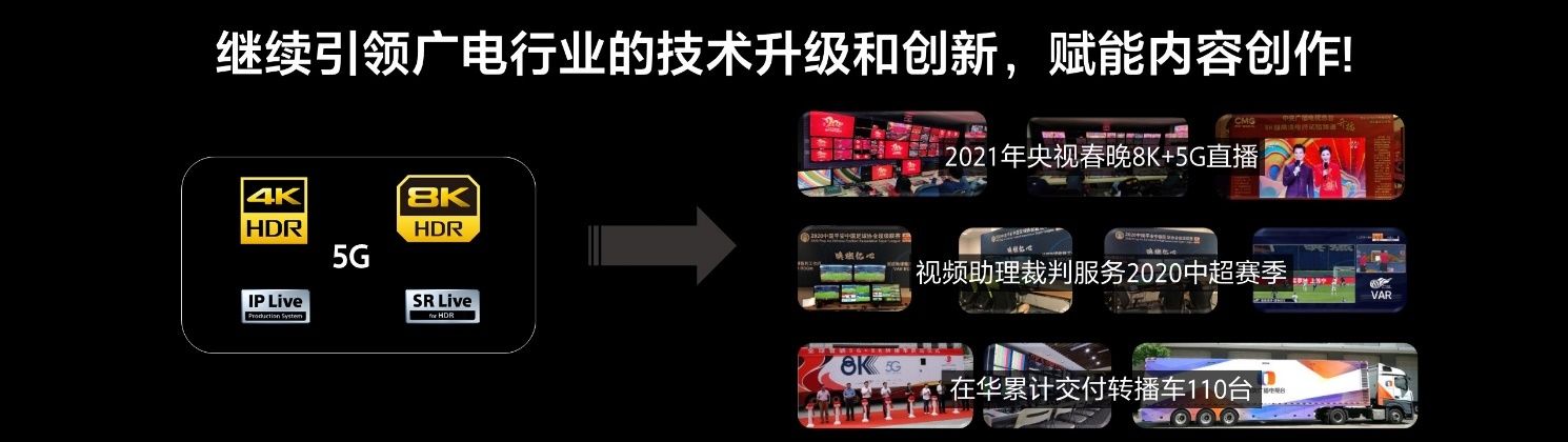 一直以来,索尼都是专业广播电视制作领域的先导,超高清化、智能化、远程虚拟制作是行业技术升级的大方向。在索尼的 4K/8K/HDR 超高清转播技术、5G 直播技术、IPlive 技术等加持下,无论工作人员是否在现场,都能以多角度的精彩素材,为观众真实、实时呈现生动的现场画面。2021 年央视春晚,首次使用索尼 8K 摄像机、XVS 切换台及 IP 系统,成功实践了 8K+5G, 8K/100P 直播制作,让亿万观众身临其境般地感受到现场的震撼与华美。2020 中超赛季,在全程封闭赛程的挑战下,索尼视频助理裁判服务业务团队,克服困难,圆满完成服务工作。在中国,索尼已经累计为客户交付了超过 110 台转播车,未来将继续引领广电行业的技术升级和创新,为感动内容的创作贡献力量。
