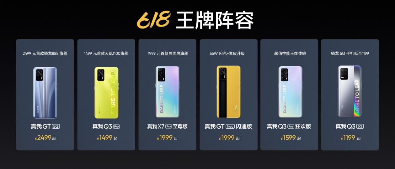 realme 真我于 5 月 25 日下午 14:00 召开真我心跳 618 发布会。6 大王牌产品、7 亿真补贴,多重惊喜秒杀等系列重磅惊喜让全民 618 嗨到心跳。王牌对王牌,realme 发布会上带来了三大价位段首款产品——2500 元内首款搭载高通骁龙 888 处理器真我 GT、1500 元内首款搭载天玑 1100 处理器真我 Q3 Pro,2000 元内首款曲面屏真我 X7 Pro 至尊版。更有真我 GT Neo 闪速版、真我 Q3 Pro 狂欢版等为大促而生的新品助阵。realme 副总裁、中国区总裁徐起宣布今年 618 目标销量 100 万台,realme 将以史无前例的促销力度迎战 618,将射门员进行到底!