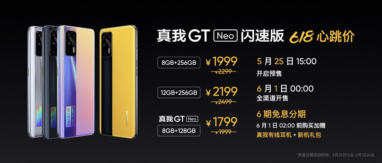 真我 GT Neo 闪速版闪充升级到了顶配 65W,同时新增了「曙光」特别版。8GB+256GB 版限时立减 300 元,起售价 1999 元。除了闪速版,真我 GT Neo 也将参与限时活动,在原价基础上再降 200 元,1799 元起!