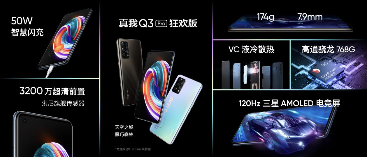 真我 Q3 Pro 狂欢版拥有「天空之城」与「黑巧森林」两款配色。配置上,真我 Q3 Pro 狂欢版采用高通骁龙 768G 芯片,搭配同级首款 120Hz 三星 AMOLED 电竞屏。VC 液冷散热技术的加持,令真我 Q3 Pro 狂欢版即使长时间运行游戏也无需担心发烫。此次真我 Q3 Pro 狂欢版延续了 realme 一贯的轻薄设计理念,174g 的轻薄机身容纳 4500mAh 大电池和 50W 智慧闪充。3200 万超高清前置、6400 万流光人像三摄,可满足全场景拍摄需求。