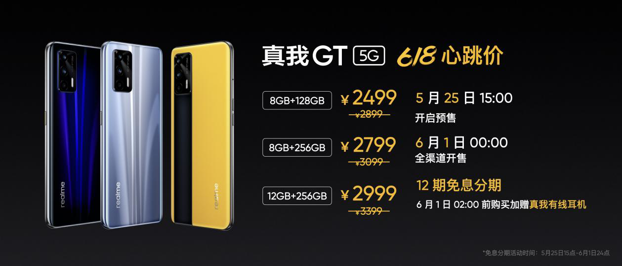 其中,真我 GT 8GB+128GB 的主力版本在 2899 的基础上直降 400 元,成为 2500 价位段首个骁龙 888 旗舰产品;真我 GT 8GB+256GB 的版本直降 300,仅需 2799 元!而备受关注的超大内存 12GB+256GB 的版本,同样直降 400,2999 元起!参与预售和购买的朋友,将享受 12 期的免息分期。6 月 1 日凌晨两点前购买还将加送真我有线耳机。