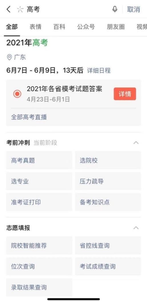 同时,微信搜一搜还分考前、考中、考后等阶段为考生及家长提供一站式高考服务。考前压力疏导、高考模拟考真题、历年高考真题,打开微信搜一搜即可获取;高校排行榜、高校招生章程、院校录取分数线、专业就业前景,为考生和家长提供志愿填报参考;高考放榜后,考试成绩及录取结果也可通过微信搜一搜便捷查询。