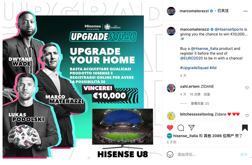 近日,据外媒报道,2020欧洲杯全球合作伙伴海信,在欧洲正式推出#UpgradeYourHome 活动,聘请德怀恩·韦德(Dwyane Wade)担任全球大使在欧洲杯期间,联手马尔科·马特拉齐(MarcoMaterazzi)和卢卡斯·波多尔斯基(Lukas Podolski)等欧洲足球名将,发起体育迷和消费者参与家电升级的互动,赢取奖金升级自己的家用电器。