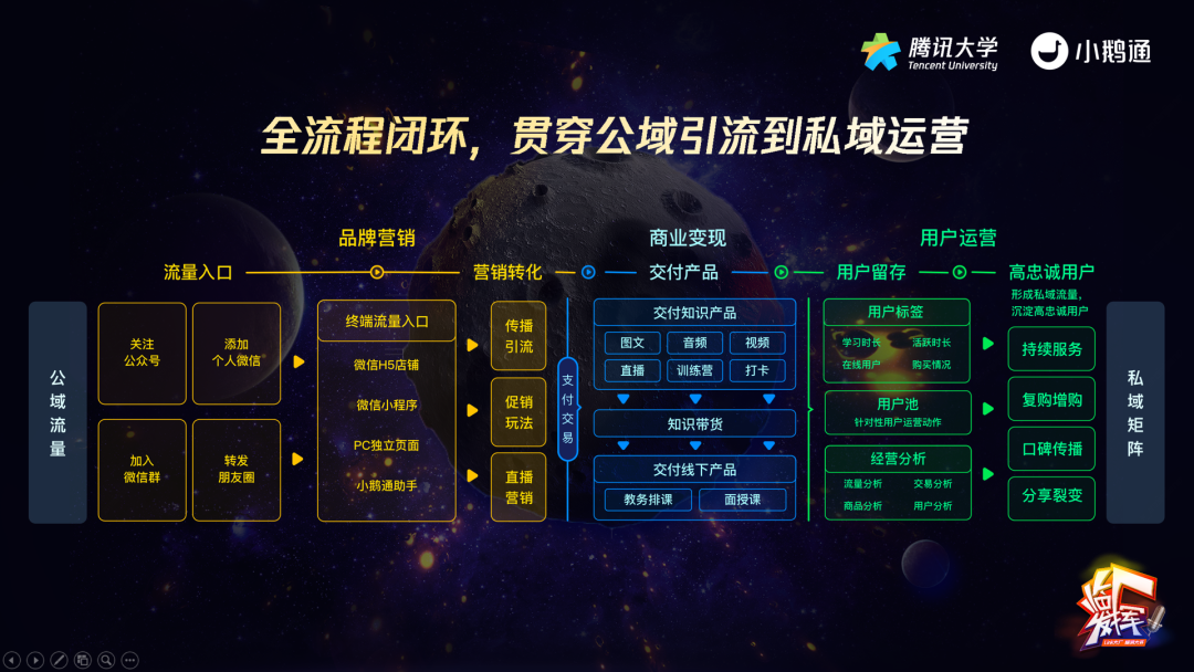 因此,小鹅通将发展核心对准微信生态,在微信生态内缩短企业与用户的沟通路径,帮助企业快速完成私域流量池的搭建,实现数字化升级。