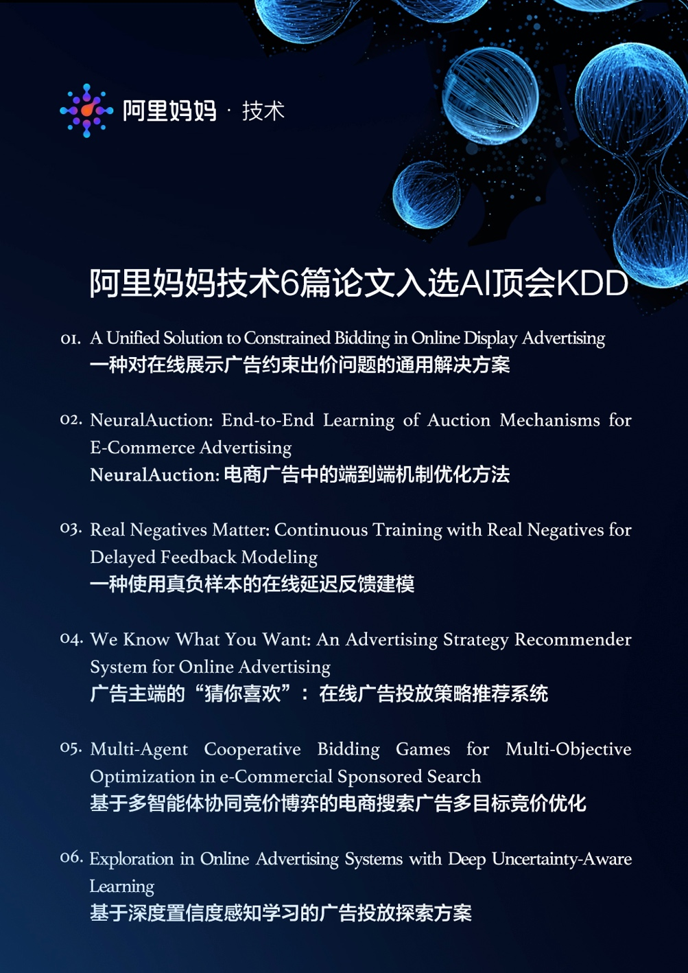 记者了解到,阿里妈妈技术团队共有 6 篇论文入选,涵盖深度学习、端到端机制优化、协同竞价博弈、投放策略推荐等多个 AI 方向,这是阿里妈妈官方首次公布其在顶会的论文接收情况。