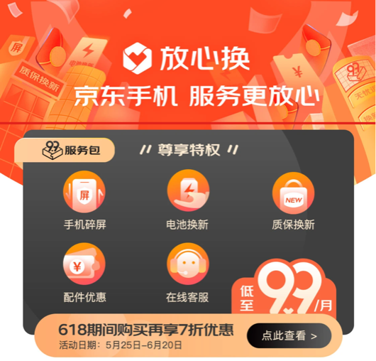 京东618巅峰盛典已来,手机品牌间的激战也在今日达到顶端,京东618除了有各种优惠福利外,还有包含30天无忧退、保值换新、一站式以旧换新、小时达、购机补贴等多项放心换服务在内的手机服务包,每月低至9.9元起,不仅能进一步提升消费者的购机体验,618期间可再享7折优惠,走过路过千万别错过这一波服务超值大礼包呀!