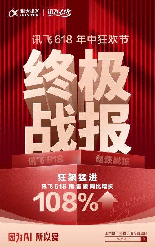 6月19日,讯飞官微公布了2021年618年中购物节战报,讯飞智能录音笔在今年的618期间取得了斐然战绩。科大讯飞全系产品销售额狂飙猛进,同比增长108%,其中讯飞智能录音笔系列连续三年蝉联京东&天猫双平台录音笔品类销售额冠军。