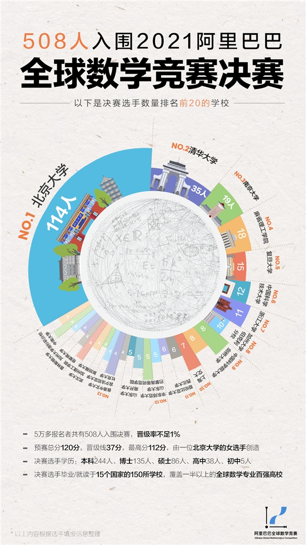 决赛选手年龄跨度从14岁到50岁,既有学生,也有各行各业的数学爱好者;学历方面,本科244人、博士135人、硕士86人、高中38人、初中5人,中学生选手数量再创新高;选手们毕业/就读于15个国家的150所学校,覆盖了一半以上的全球数学专业百强高校。