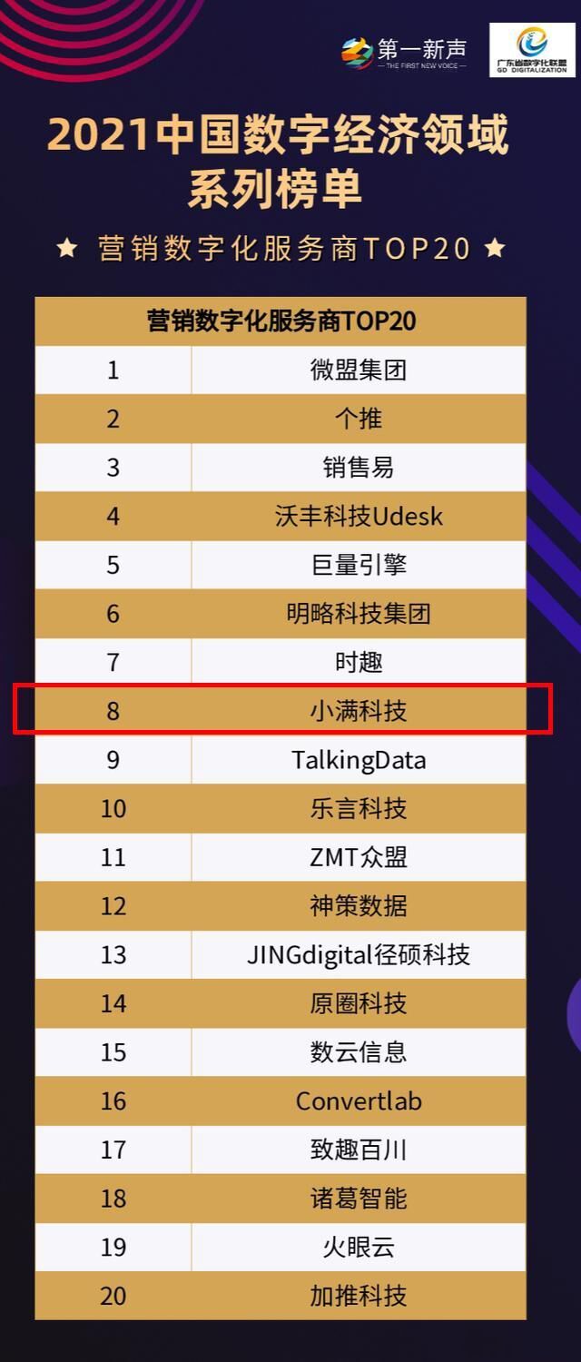 今年两会,“加快数字化发展,建设数字中国”写入“十四五”目标,产业数字化对经济发展的推动作用显著增强,企业数字化发展势在必行。为深入了解中国企业数字化发展现状,国内有影响力的科技产业信息服务平台第一新声联合广东省数字化联盟,展开“2021年中国数字经济领域系列榜单”评选。日前,入选名单正式揭晓,行业领先的出海SaaS服务商小满科技名列“营销数字化服务商TOP20榜单”,与微盟集团、巨量引擎等共同领衔中国营销类数字化服务商前沿阵营。