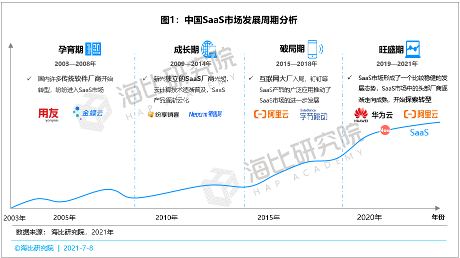 一、中国SaaS市场发展历程分析:中国SaaS市场发展已经经历了四个阶段,现已进入旺盛期