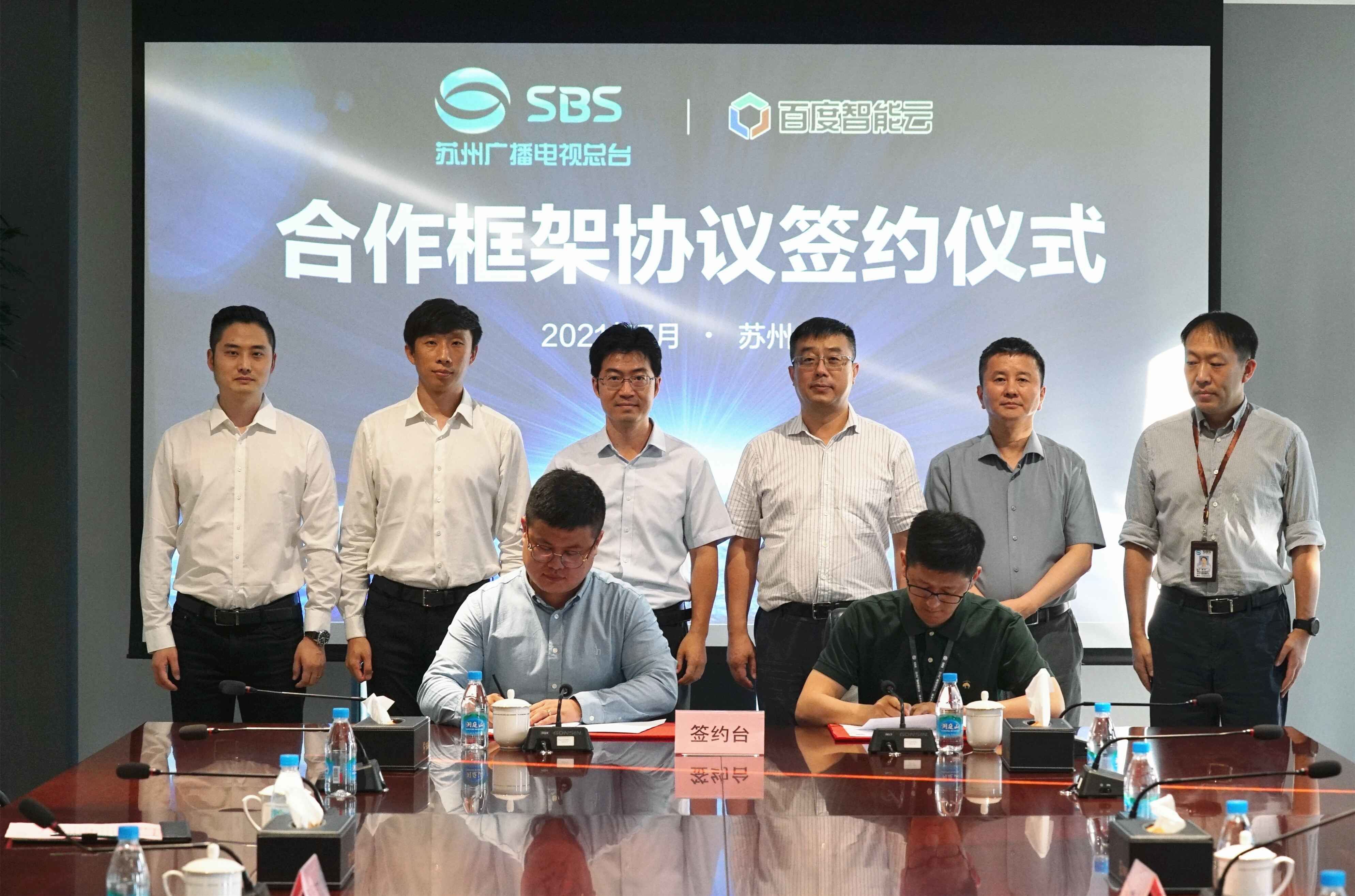 苏州市广播电视总台党委委员、总工程师郭昌雄,党委委员、副台长王晓雄,技术中心(新媒体技术部)主任瞿向雷,百度智能云科技、媒体、通信业务部总经理张继超,百度智能云GTM创新行业部总经理张乐,百度智能云广电媒体行业业务总监王峰,百度智能云广电媒体行业客户经理伊磊出席签约仪式。