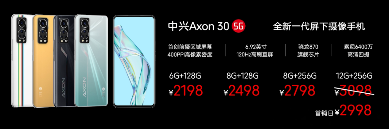 即日起中兴 Axon 30 5G 将在中兴商城、京东、天猫、苏宁、抖音、快手、拼多多、浦惠到家等平台开启预售/预约,并于 8 月 3 日全渠道正式开售。6G+128G 版售价 2198 元,8G+128G 版售价 2498 元,8G+256G 版售价 2798 元,12G+256G 版售价 3098 元。其中,12G+256G 版首销日仅售 2998 元。同时,中兴还推出了真混合全场景主动降噪 TWS 耳机新品 ZTE LiveBuds Pro,售价 349 元,以及超长续航、轻巧机身的 TWS 耳机 ZTE Buds,售价 169 元。