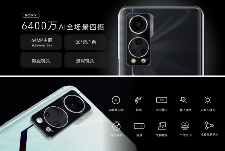 沿袭中兴 Axon 系列强大拍摄功能,中兴 Axon 30 5G 配备包括 6400 万超高像素主摄像头,120 度广角摄像头,3cm 微距镜头,及景深镜头组成的全场景 AI 四摄,可进行多摄像头同时拍摄,支持超级夜景、魔法换色等功能。视频拍摄支持主摄及广角双路视频防抖,动态视频拍摄效果更加清晰稳定。
