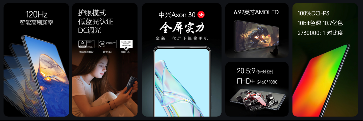 屏幕方面,中兴 Axon 30 5G 是全球首款配备 120Hz 高刷新率的屏下摄像手机,支持 360Hz 触控采样率。6.92 英寸 AMOLED 超大天幕全景屏具备 10.7 亿色显示,20.5:9 的影院级荧幕比例,匹配 DTS:X® Ultra 沉浸式 3D 音频技术,带来高品质观影体验。此外,作为全球首款通过德国莱茵 TUV、瑞士 SGS、美国 UL 三大权威护眼认证的手机,新机可降低蓝光辐射,支持 DC 调光,有效减少屏幕闪烁带来的视觉疲劳。