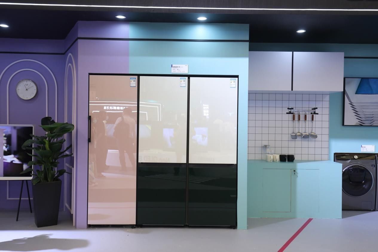 走进“定艺生活”区域,绚丽的色彩和光影的冲击共同打造了极富时尚感又不失温馨浪漫的氛围。在“单身贵族”版块,可以赫然看见引人注目的Samsung BESPOKE系列冰箱。作为集颜值和实力于一身的家电产品,Samsung BESPOKE系列冰箱,不仅拥有出色的功能和技术,更是凭借炫彩外观和个性化定制C位出道,不断刷新用户的感官体验。