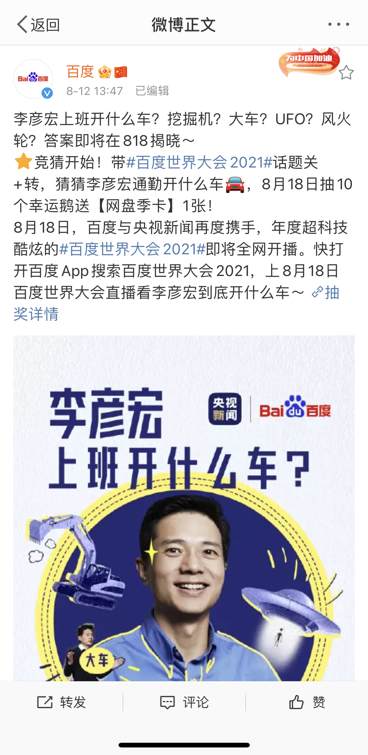 最近,百度官方发布了一张百度世界大会2021的预热海报,海报中提出一个问题——李彦宏上班开什么车?海报中天马行空地画出了挖掘机、飞碟、风火轮等,虽然没有给出李彦宏通勤车的答案,但也间接透露了世界大会将会有汽车相关的大动作,会是百度造车新进展还是Apollo无人驾驶技术突破?