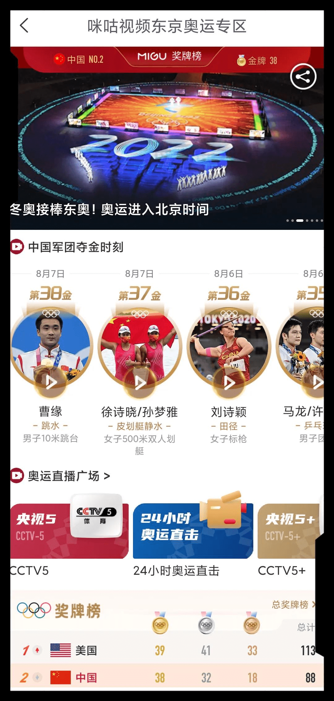 奥运期间,中国移动咪咕推出了全量赛事高清直播、点播,且支持多视角观赛,精心制作了多档奥运衍生节目。同时,咪咕APP里设计了种类丰富的趣味性互动,为用户提供了全新的体育观赛体验,让国人通过屏幕与健儿们一同感受奥运赛场上的紧张、激动、坚持与骄傲。咪咕累计热搜300+个,单日曝光量12.7亿+,累计曝光量333亿+。