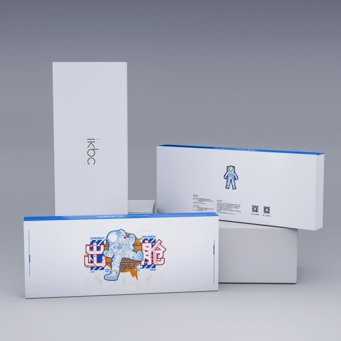 联名键盘的外包装设计延续了ikbc一贯的简约风格,以干净的蓝白配色为主,背景辅以蓝色、橙色色块,画面主体为略带科技感的“出舱”二字,再搭配航天员的线稿形象,以及隐约可见的“电路板”,整体风格清爽,却又透露出浓厚的机械感。