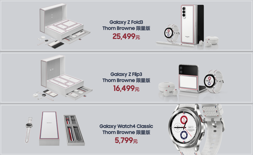 为了让科技与时尚更深层次地融合,并满足众多走在潮流前沿消费者的需求,三星再度携手 ThomBrowne,为此次推出的三星 Galaxy 新品附上了更具标志性的外观设计,将工艺品质与视觉品味结合带来的时尚韵味提升到新的高度。无论是白色哑光背板、银色铰链,还是嵌于机身上的 ThomBrowne 标志性色彩元素,均造就了与众不同的时尚品味,为消费者带来只属于三星与 ThomBrowne 的独特气质与鲜明个性。三星 GalaxyZFold3 5G Thom Browne 版建议零售价 25,499 元,三星 GalaxyZFlip3 5G ThomBrowne 版建议零售价 16,499 元,9 月 8 日上午 10:08 正式开抢,三星 GalaxyWatch4 ClassicThomBrowne 版建议零售价 5,799 元,将于 10 月中旬开抢,敬请期待。