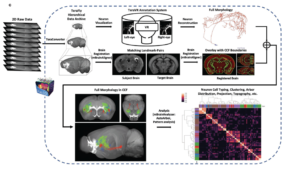 科学家们需要详细分析小鼠全脑三维数据集,其包含上万个XY平面的冠状图像,使用TeraVR虚拟现实标记系统对3D图像进行人工标记,来重建每个神经元的完整形态。