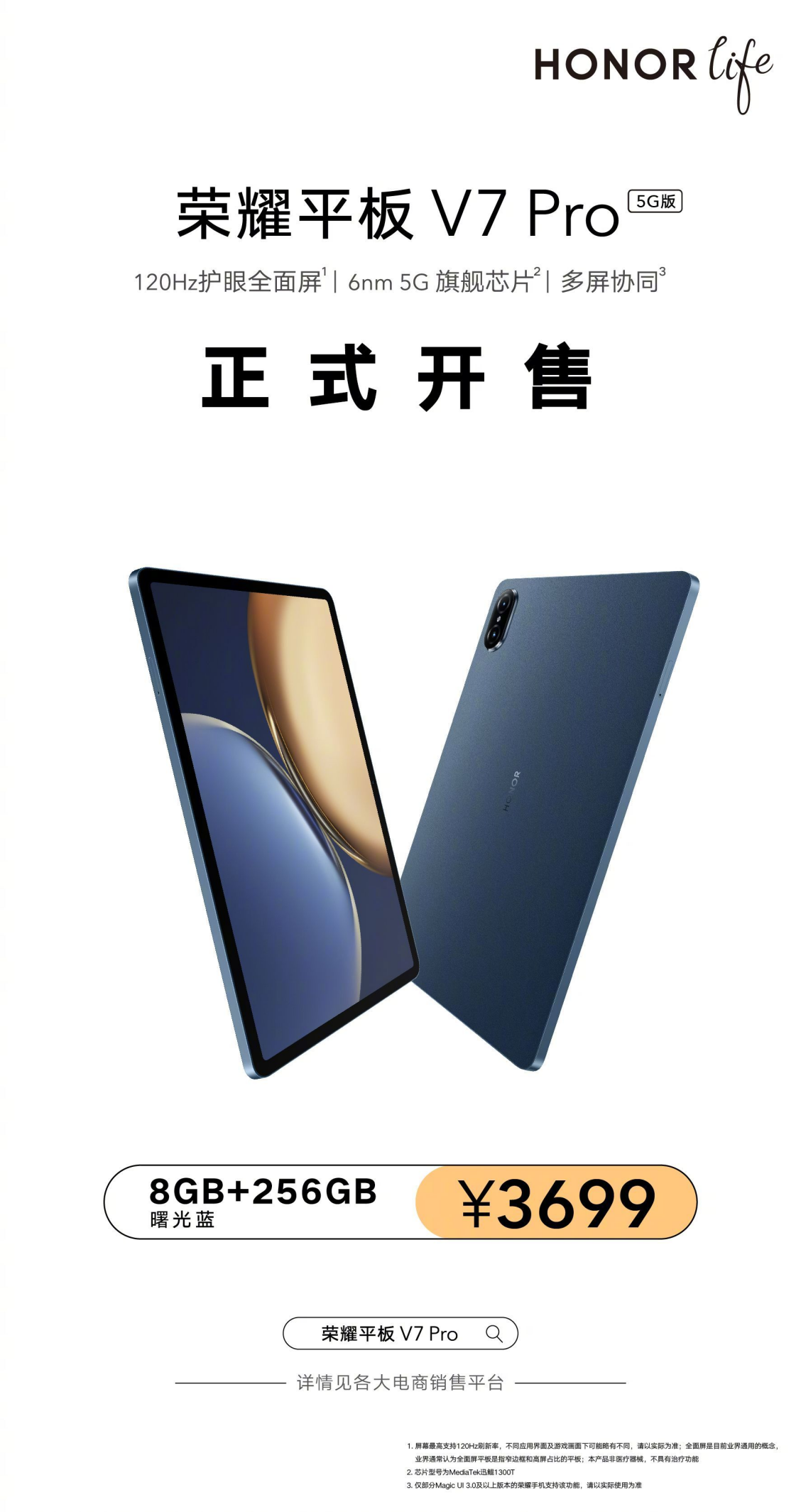 目前,荣耀平板 V7 系列在荣耀商城、各大授权电商,以及荣耀体验店和荣耀授权店同步销售,供货充足。荣耀平板 V7 Pro 5G 版 8G+256GB 曙光蓝售价 3699 元,想入手的朋友们不要错过。