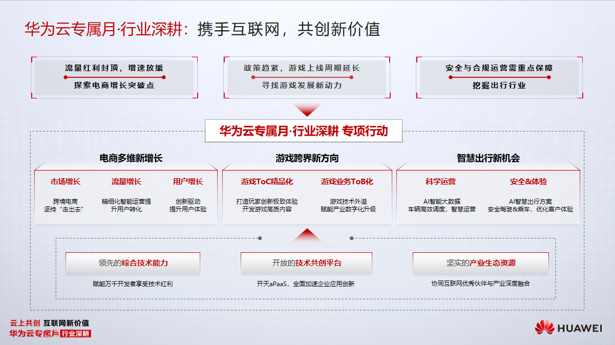 据悉,此次华为云专属月行业深耕行动,将重点聚焦电商、游戏、移动出行产业链上下游,与行业伙伴/客户,共创新价值、探索新机会。