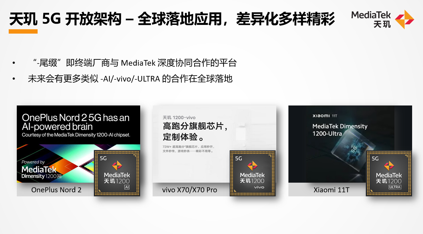 以天玑 1200 移动平台为基础,MediaTek 与一加、小米、vivo、realme 等终端厂商深度协同合作,通过天玑 5G 开放架构共同打造了天玑 1200-AI、天玑 1200-Ultra、天玑 1200-vivo 等平台,充分释放旗舰潜能,赋能终端打造差异化的高端 5G 智能手机体验。