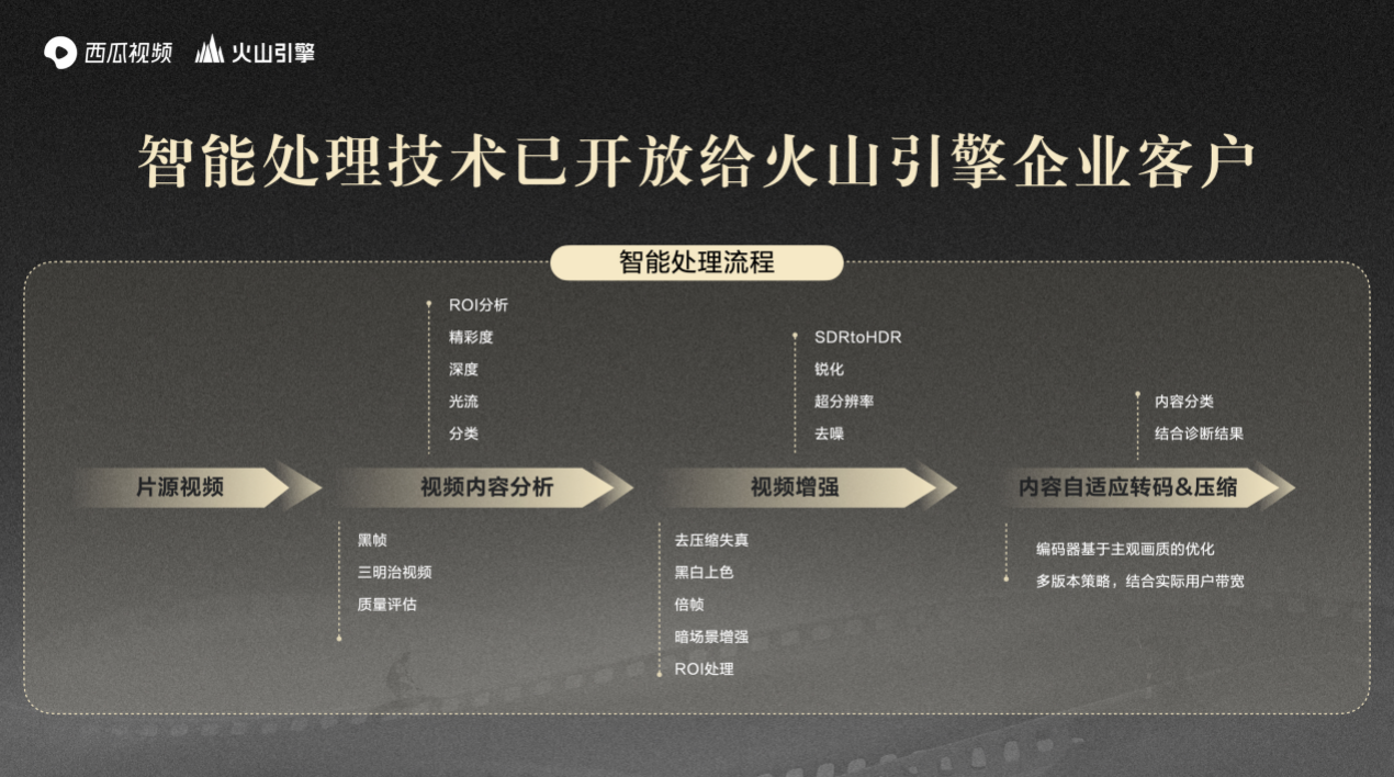 基于在抖音等业务上的技术能力积累,火山引擎于今年七月推出「智能处理」工具包,通过超分辨率、智能插帧、色彩增强、降噪等算法实现增强视频画质的效果。
