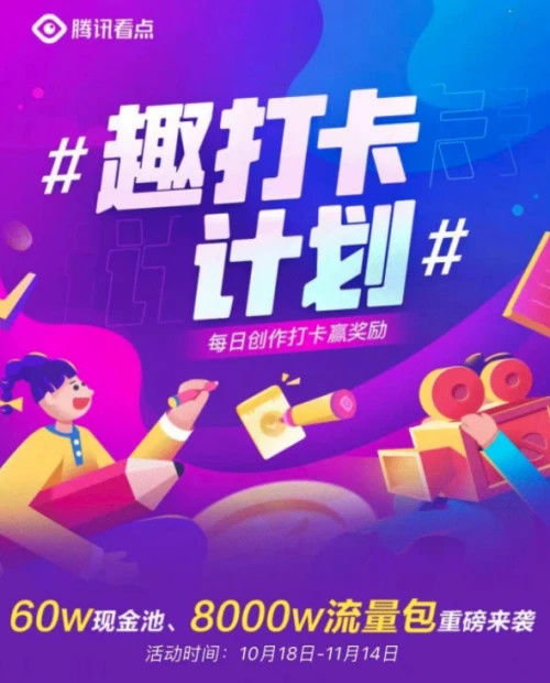 近日,腾讯看点推出“趣打卡计划”活动,面向看点平台的视频创作者,提供60万现金池和8000万流量包激励。作者只需通过看点App每天发视频打卡,即可领取流量包、解锁现金奖励,并有机会获得MVP大奖。