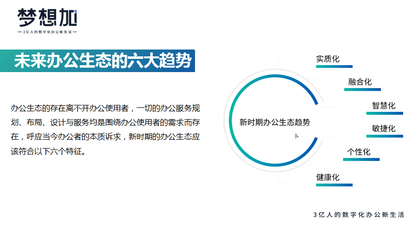 作为行业第一份办公生态白皮书,其内容汇总了未来办公生态的六大发展方向:实质化、融合化、智慧化、个性化、敏捷化、健康化。