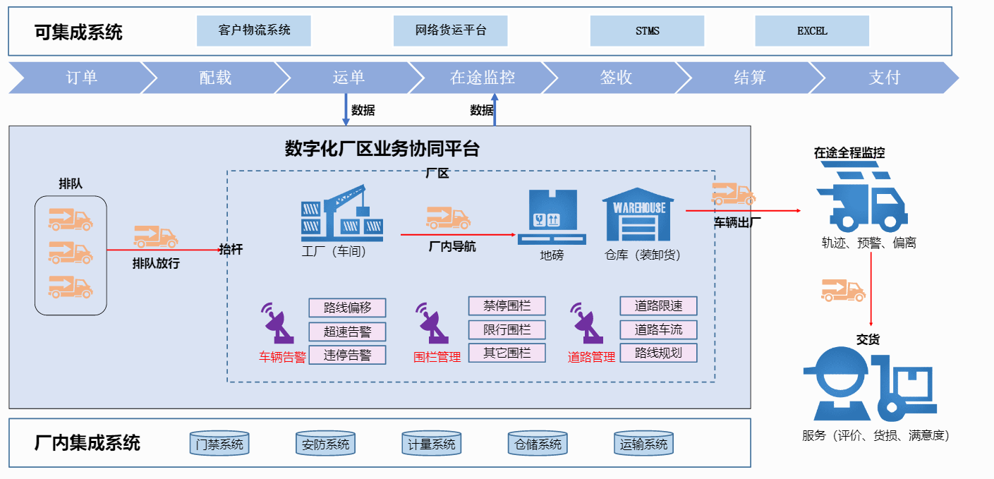 “数字化厂区业务协同平台”是中交兴路重点产品之一,服务于钢铁、冶金、快消等生产制造企业和物流企业,以及中大型物流园区。该产品基于中交兴路物流科技中台,实现了厂区地图、车辆监控、安防监控、路线导航等功能,有效解决了厂区无地图、无导航、无厂区监控等实际需求,实现物流运输系统一体化、可视化、透明化、数字化,管理简单、智能、高效。该解决方案能够帮助企业全面监管运输车辆从进厂到出厂的厂区作业全流程,实现高效调度。同时,方案能够实现供应链上下游业务协同,将传统线下结算转线上,通过物流可视化降低物资经济损失,降低厂内运费成本,提升企业经济利润空间。