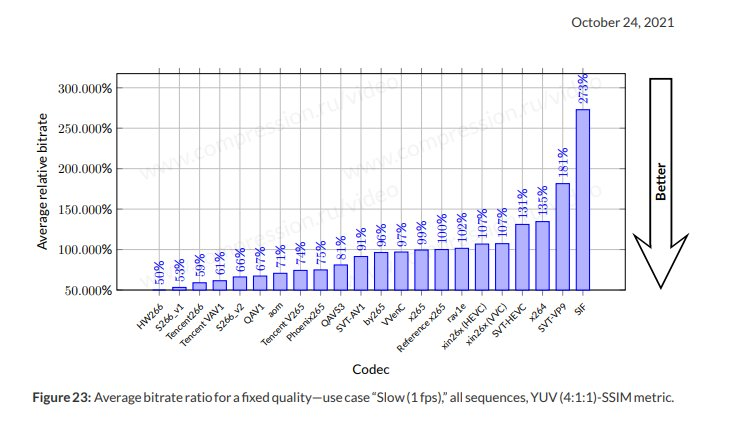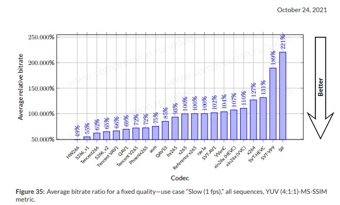 以下是华为HW266编码器在Slow赛道(极致压缩领域)的YUV-SSIM和YUV-MS-SSIM指标下的得分情况:分别是49.9%、49.1%。值得一提的是,这两项得分是所有参赛当中唯一突破50%的编码器。