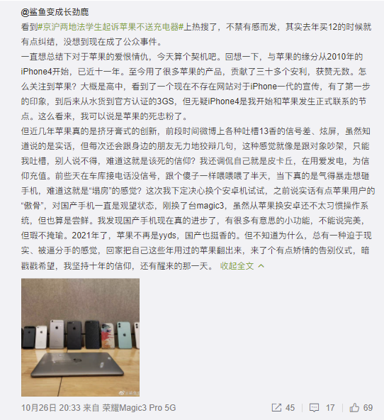 最近一则十年果粉「倒戈」荣耀手机的事件引发消费者的关注。一位资深苹果用户发微博与自己曾使用的多代 iPhone 手机进行了一场有仪式感的告别,同时换成了荣耀 Magic3 系列。这位果粉表示,「近几年苹果真的是挤牙膏式的创新,前段时间微博上各种吐槽 13 香的信号差、炫屏」。最终他下定决心换个安卓机试试,换成了荣耀 Magic3 系列,「我发现国产手机现在真的进步了,有很多有意思的小功能,不能说完美,但瑕不掩瑜。2021 年了,苹果不再是 yyds,国产也挺香的」。由此可见,以荣耀 Magic3 系列为代表的国产手机,其实已经在各方面成为更多手机用户的新选择。