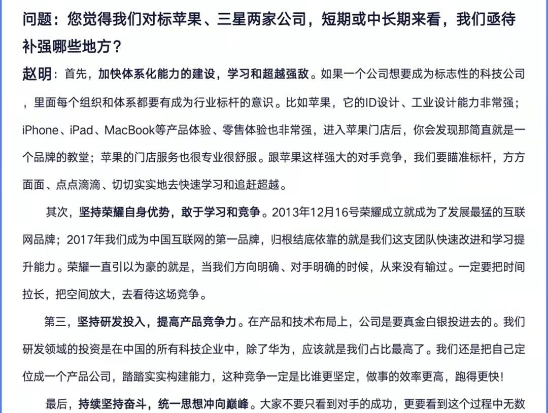 而面对与国际品牌比肩争高低的现状,早在荣耀 Magic3 系列发布会后荣耀 CEO 赵明就曾表示,荣耀的竞争对手只有苹果。在媒体最新获得的一段「荣耀内部会议」纪要中,赵明再次强调,跟苹果这样强大的对手竞争,荣耀要瞄准标杆,方方面面、点点滴滴、切切实实地去快速学习和追赶超越,并表示「当我们方向明确、对手明确的时候,从来没有输过」。而今日路透社发布的新闻中也提到了荣耀是苹果在中国的最大竞争对手。