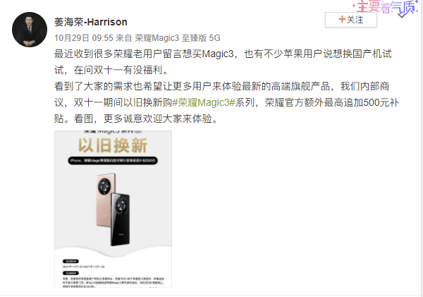 苹果用户转投国产手机,荣耀 Magic3 系列受追捧