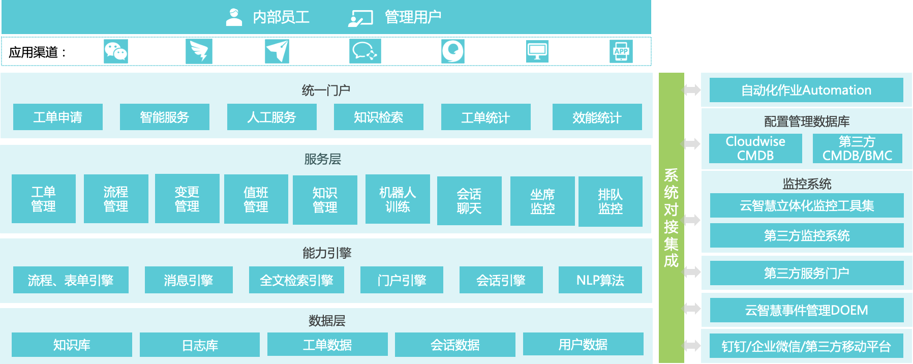 秉承“持续进化”的理念,云智慧在IT服务管理领域以DOSM产品为中心,以 IT服务管理咨询和实施交付为两个基本点纵横发展,打造从规划到落地全流程的IT服务管理解决方案与服务体系,联合业界顶级合作伙伴,助力企业实现IT服务精细化管理。