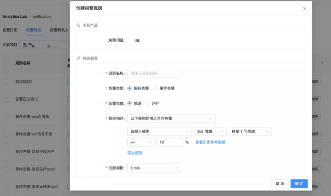 指标告警和事件告警规则可设定为监测所有频道或用户,也可以设定为监测指定频道或用户。例如,近期有一个重要的视频会议,可以在后台针对该会议室设定一个实时告警规则,专门用于监测该会议项目的质量情况。