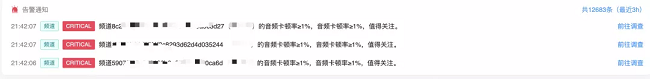 在水晶球 3.0 的实时监控页面中,告警模块会显示过去三个小时内最新的三条告警,开发者和企业可以根据需求自定义告警规则、告警方式。例如,在发现某一频道视频卡顿率超过 5% 的时候,发送告警邮件和短信给 5位“告警联系人”。