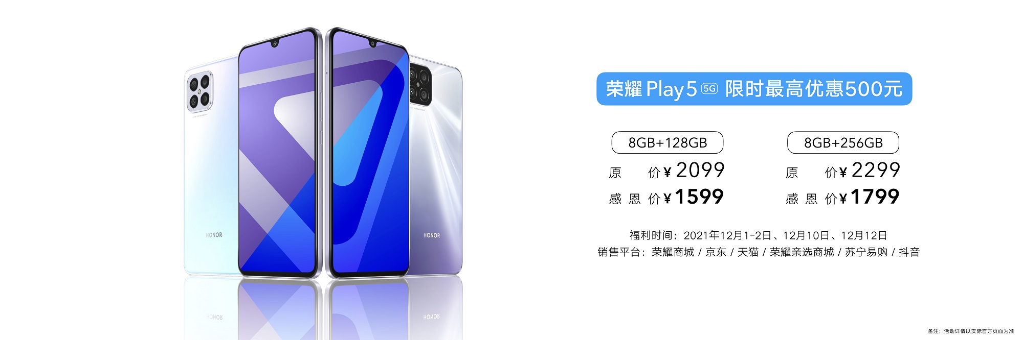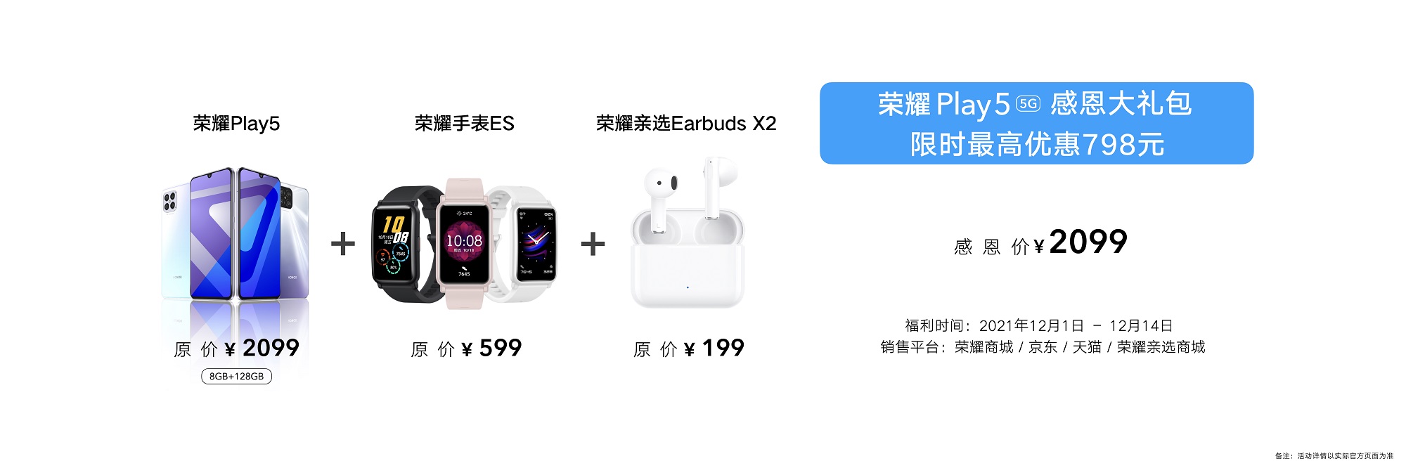12月1日-12月14日,荣耀Play5感恩大礼包限时开售。荣耀Play5 8GB+128GB版本搭配荣耀手表ES以及荣耀亲选Earbuds X2蓝牙耳机,限时最高优惠798元,礼包感恩价为2099元,加量不加价!同时,荣耀Play5活力版搭配荣耀手表ES及亲选Earbuds X2耳机,限时最高优惠398元,礼包感恩价为2199元起。欢迎前往荣耀商城及各大电商荣耀官方旗舰店选购。