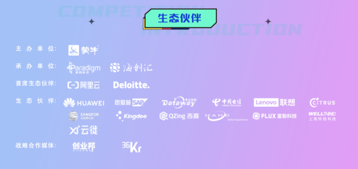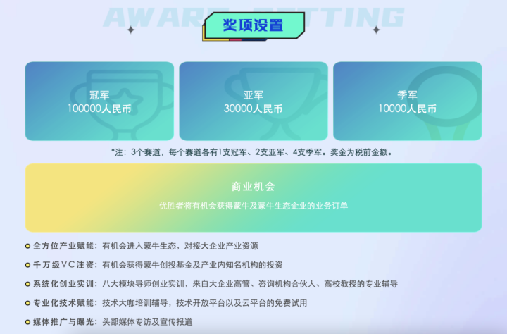 本次大赛不仅集结了蒙牛集团总裁卢敏放、阿里巴巴副总裁贾扬清、知名财经作家吴晓波等大咖亲自助阵。优胜者更将享有蒙牛商务订单及工作机会,60万元奖金池,蒙牛、第四范式及各合作单位的千万级投资机会等权益。
