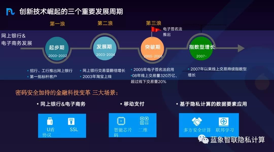 以金融行业举例,第一浪,是找到第一批“吃螃蟹”的客户。2000年的时候,招商银行、工商银行率先推出了网上银行,成为第一批“吃螃蟹”的用户。第二浪就是让第一批“吃螃蟹”的客户得到好处,如网上银行的交易量开始实现增长。到第三浪,就是监管环境和法律法规的突破。一个标志事件就是电子签名法的推出,这是密码学技术和法律的突破。电子签名法明确了线上电子签名的合法性,极大缩减了当年人工处理金融交易的步骤和手续,提高了业务的处理效率。电子签名法的合法性,再加上其背后的密码学及U盾等密码安全保护措施,让网上银行及电子商务的交易量在2008年就已达到320万亿,也是首次实现了线上交易量超过线下柜台交易量的目标。