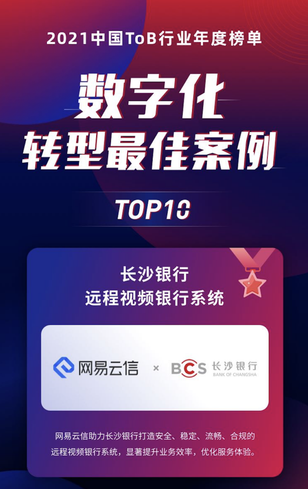1 月 7 日,「ToB 行业头条」联手 3W 集团正式发布《2021 中国 ToB 行业年度榜单·数字化转型最佳案例 Top10》。作为金融数智时代的赋能者,网易云信凭借长沙银行「远程视频银行」项目成功入选。