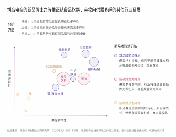 《2022 抖音电商新品牌成长报告》提到,食品饮料、美妆行业的市场规模可观,商品也有足够的创新空间,已成长为当前新品牌聚集的主力阵地;而服饰鞋包、酒/膳食滋补、母婴宠物、智能家居、个护家清等行业的供需现状有利于填补某些需求空白,或在商品开发上有更广阔的空间。特别是交易规模相对领先的服饰鞋包行业,有望更快迎来新品牌的爆发。