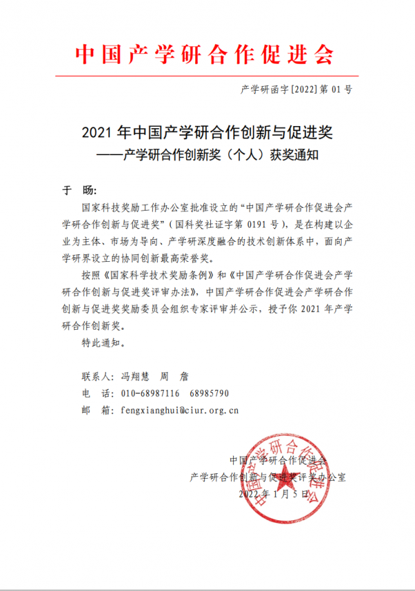 「中国产学研合作促进会产学研合作创新与促进奖」旨在鼓励和表彰在推进政产学研金服用协同创新工作中作出突出贡献的先进单位和个人。该奖项由国家科技奖励工作办公室批准设立,是面向产学研界的协同创新最高荣誉奖。
