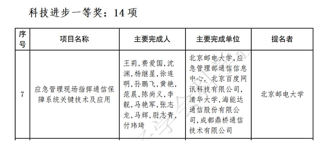 近日,中国电子学会公布了「2021 中国电子学会科学技术奖」授奖名单。由百度智能云联合北京邮电大学、应急管理部通信信息中心、清华大学等政、产、学、研单位共同申报的「应急管理现场指挥通信保障系统关键技术及应用」获得科技进步一等奖。