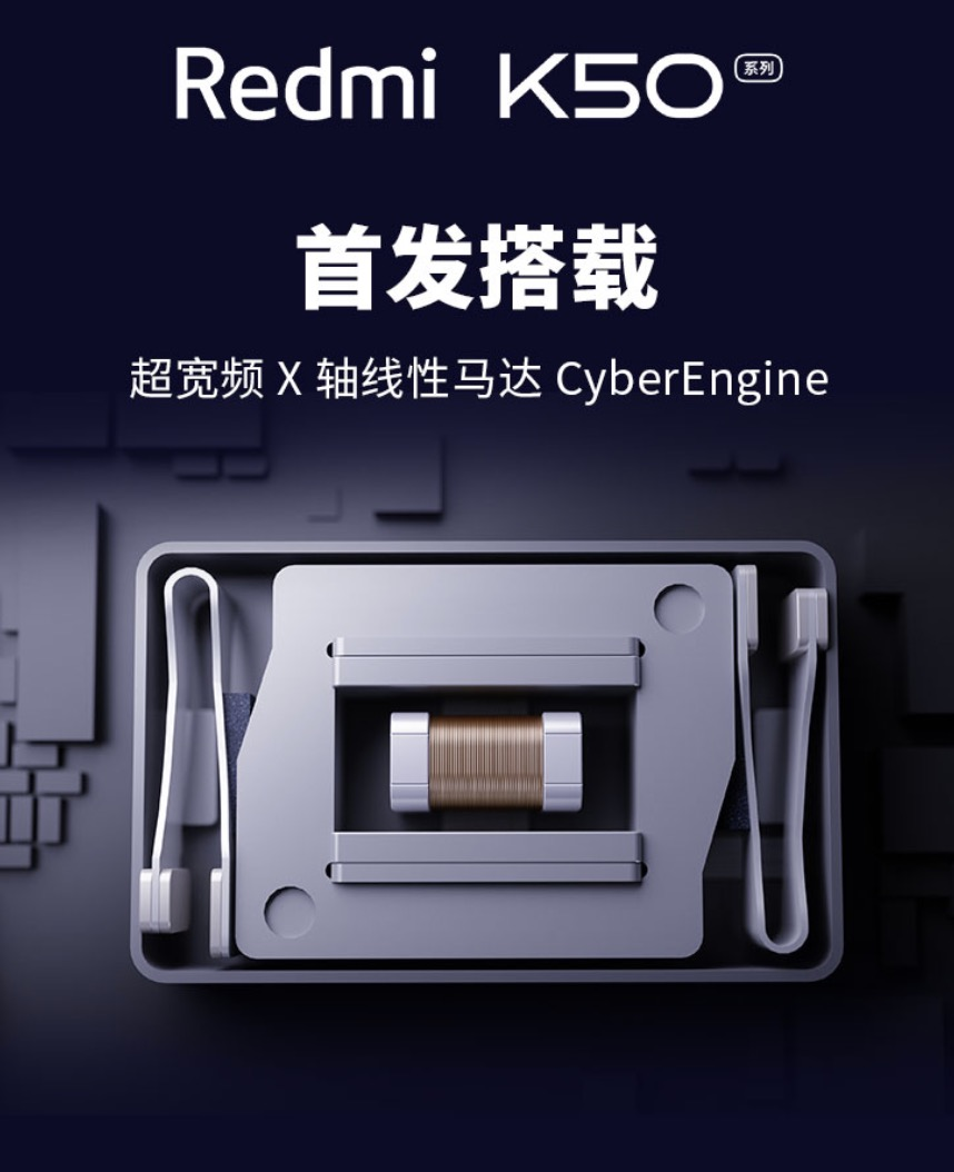 春节后即将发布的 Redmi K50 系列首发搭载这款可用于「元宇宙」产品的超宽频 X 轴线性马达 CyberEngine,将超宽频、多层次、超现实、全链路的触感体验带给每一位用户。