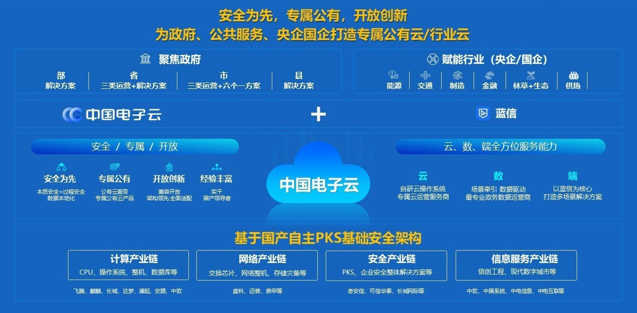 云办公所需的各类数字化办公应用需要以移动平台为依托。作为中国电子 PKSM 自主技术体系中的关键一环,蓝信与中国电子云共同打造了高安全的「一云一端」,构建政企办公数字化底座,发挥平台级基础设施的「协同」能力,发力云、数、端全方位服务,助推广大政企管理能力和管理效能提升。与天翼云达成合作,实现与中国电信「云改数转」战略的深度融合;与浪潮云共建的「浪潮云舟联盟」,驱动了工业互联网与农业领域的深度融合,助力农业数字化升级与变革。