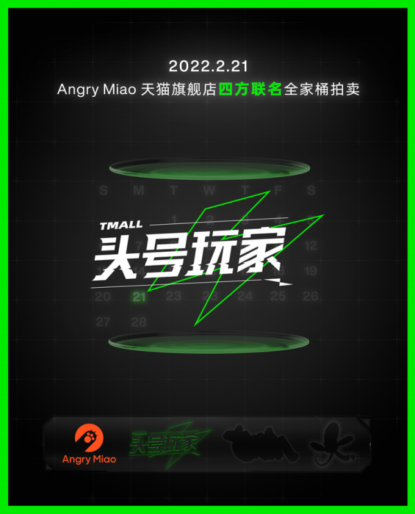 怒喵科技 ( Angry Miao)天猫官旗店即将在 2 月 21 日开业,今日,怒喵科技宣布开业当天将通过拍卖活动与天猫头号玩家推出全球唯一一套怒喵 x 天猫头号玩家四方联名款全家桶,用户可一次性集齐怒喵经典单品。且本套「CYBERVERSE」全家桶还将携手一位艺术家以及一位 B 站 up 主进行合作,具体联名方与产品有待揭晓。