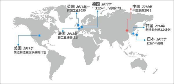 面对新一轮工业革命,世界多国都在积极推进智能制造战略,包括中国(中国制造 2025)、美国(先进制造业国家战略计划)、德国(工业 4.0 战略计划)、英国(英国工业 2050)、法国(新工业法国计划)、日本(社会 5.0 战略)、韩国(制造业创新 3.0 计划)等,它们都将智能制造作为构建本国制造业竞争优势的关键举措。